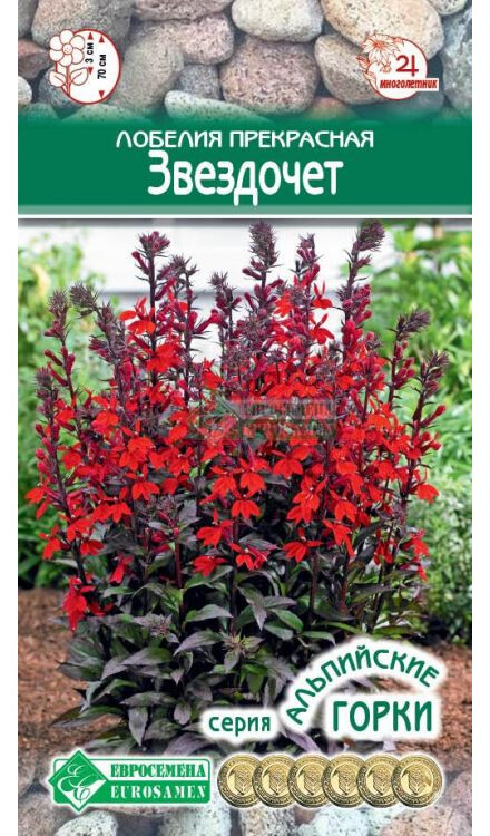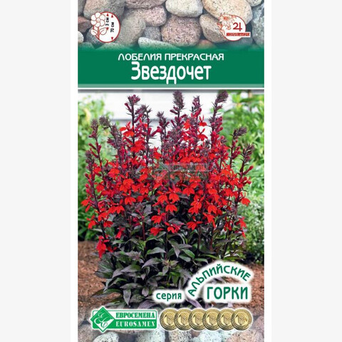 Лобелия прекрасная — великолепное растение семейства Колокольчиковые, усыпанное яркими, крупными и необычными цветками, всегда находится в центре внимания садоводов. В умеренных и тропических районах земного шара распространены около 300 видов лобелии. Применяется как декоративно-лиственное и красивоцветущее растение в цветниках, рабатках и группах, в бордюрах и ковровых композициях, как растение-солитер на фоне зеленого газона, в монохромных посадках на рабатках, рекомендуется для больших пейзажных групп и ландшафтных участков. Лобелия Звездочет выделяется нестандартной формой больших цветочков, более компактным, выровненным габитусом растений. Алые соцветия, похожие на колосья, вырастают на тёмно-фиолетовых стеблях. А вот у ланцетных листьев окраска зелёная. Этот сорт применяется в цветниках, одиночных посадках и цветочных композициях. Ещё она выращивается в горшках и крупных вазонах. За растением не нужно долго ухаживать, но ему нужна влажная почва и солнечный свет. Отличается ранним цветением, прекрасно переносит жару.