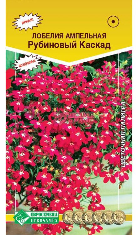 Лобелия — культура с обильным и приятным глазу цветением, благодаря чему она довольно часто используется для украшения клумб на отрытом грунте и создания впечатляющих композиций из подвесных кашпо. Бесконечное количество мелких синих, сиреневых, розовых, белых или красных цветов на фоне темно зеленой листвы, словно ковер преображает и дополняет основную композицию ландшафта, не менее эффектно, чем розы. Среди цветоводов наибольшую популярность получило выращивание лобелии ампельной (каскадной), которая характеризуется длинными побегами, быстро формирующими шаровидный габитус растений, для чего лобелии рекомендуется прищипывать, что поспособствует образованию красивой кроны и хорошей ветвистости. Рубиновый каскад быстро сплетает пышный каскад из пурпурно-красных очаровательных цветочков, и на фоне нежной светло-зеленой листвы выглядит очаровательной и хрупкой. Используется для выращивания в балконных ящиках, в висячих корзинах и уличных вазах. Идеальное решение озеленения балконов, создания почвопокровных клумб. Высота растения-30 см Диаметр цветка-1-2 см