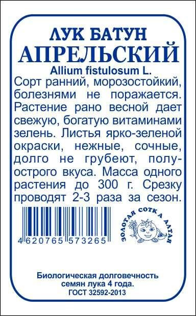 Сорт раннеспелый, морозостойкий, болезнями не поражается. Растение рано весной дает свежую, богатую витаминами зелень. Листья яркой зеленой окраски, нежные, сочные, долго не грубеют, полуострого вкуса. Масса одного растения до 300 г. Срезку проводят по мере отрастания пера. Используют в свежем виде, в кулинарии, для заморозки и сушки.