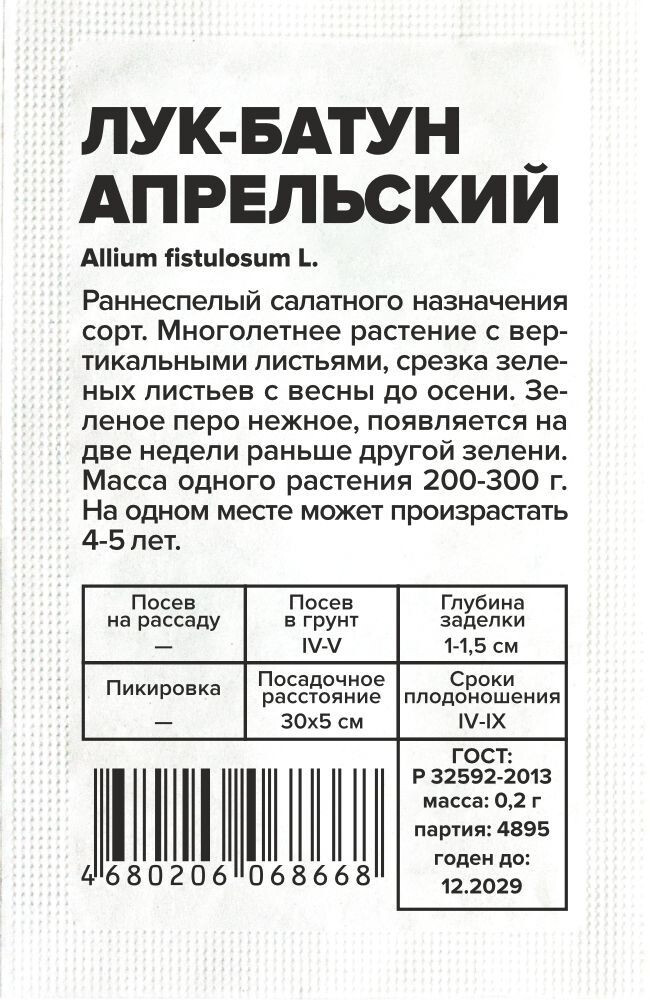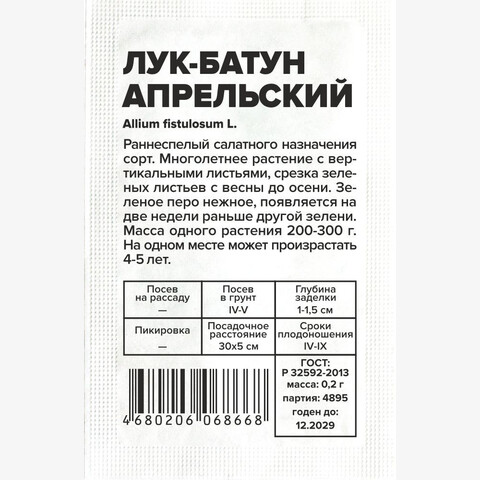 Раннеспелый салатного назначения сорт. Многолетнее растение с вертикальными листьями, срезка зеленых листьев с весны до осени. Зеленое перо нежное, появляется на две недели раньше другой зелени. Масса одного растения 200-300 г. На одном месте может произрастать 4-5 лет. По содержанию витаминов и аминокислотному составу очень близок к листьям лука-репки. Устойчив к болезням и неприхотлив к погодным условиям. Место посадки: солнечные участки с плодородной нейтральной рыхлой почвой. Размещается после бобовых, капусты, раннего картофеля. При размещении учитывать, что батуны и другие луки на зелень - многолетние Освещение: обильное, плохо переносит затенение Предпосевная подготовка: инкрустированные семена (покрытые цветной оболочкой) не требуют подготовки. Необработанные семена (черные) на 15 минут замочить в термосе с водой температурой 45-50°C Сроки посева: весной сеют в грядку, когда земля прогреется до 10…12°С (март-май) Посев на рассаду: не предусмотрен Посев в грунт: в почву вносят перепревшие органические удобрения и песок, хорошо рыхлят. Бороздки размечают на глубину 1,5 см, между рядками оставляют 15-20 см. Семена раскладывают на уплотненный грунт на расстоянии 2-3 см или пучками через каждые 10-15 см. Присыпают слоем грунта 1,5 см и уплотняют. Обильно поливают горячей водой (65-70°C), накрывают пленкой или укрывным материалом до появления всходов Пикировка/перевалка: не предусмотрено Уход: регулярный и обильный полив на протяжении всего периода вегетации, рыхление междурядий. Для омоложения, во второй половине лета зелень срезают под корень на отрастание