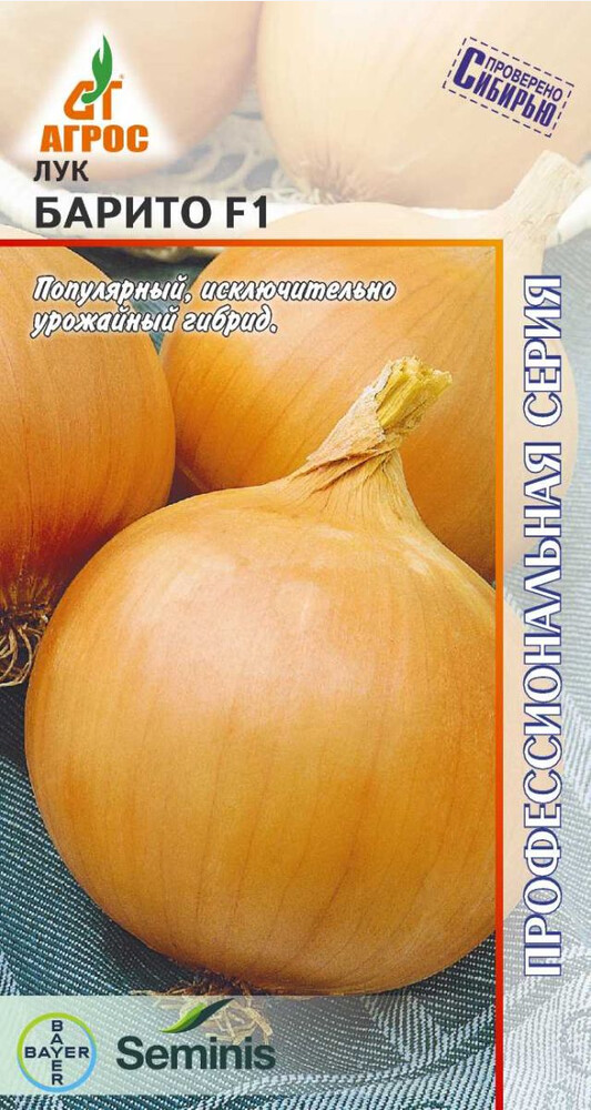 Популярный, исключительно урожайный гибрид. При посеве семенами за один сезон формирует луковицу отличной формы. Луковица округлая, очень крупная, выровненная. Сухие чешуи коричнево-желтые, сочные — белые. Остро-сладкий вкус луковиц идеален для приготовления блюд домашней кулинарии. БАРИТО F1 отличается прекрасной лежкостью и повышенной устойчивостью к заболеваниям. Особенности выращивания: в начальный период роста необходим достаточный полив и рыхление. При выращивании через рассаду можно получить более крупную луковицу. Плохо растет на кислых почвах, требуется раскисление. - IV V V 10x20 IX