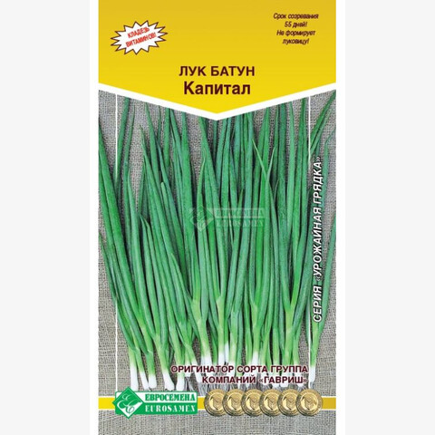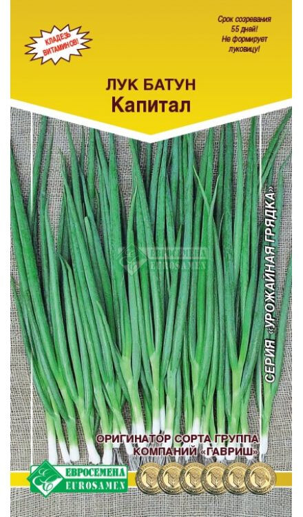 Лук (батун) популярен во всем мире, его любят за неприхотливость, простоту ухода и оригинальный вкус. Родиной этого лука считается Азия, однако, на сегодняшний день растение распространено повсеместно, практически на всей территории России, за исключением регионов Крайнего Севера. В отличие от распространенного репчатого лука, зелень батуна не такая острая и не дает неприятного послевкусия. Поэтому овощ очень распространен на огородах, а справиться с его выращиванием сможет даже новичок. Капитал - лук батун, который не формирует луковицу. Срок созревания 55 дней. Растения мощные, перо длиной до 60 см, зеленое, с сизым оттенком и слабым восковым налетом. Листья лука батуна считаются готовыми для уборки при достижении ими высоты 25-30 см.