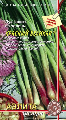 Лук-Шнитт Красный великан. Шнитт-лук (лук-резанец, лук-скорода) (Allium schoenoprasumh) - многолетнее травянистое растение семейства Луковые (Alliaceae). Луковица средняя, продолговато-яйцевидная. В гнезде находится до 15 луковиц. Стебель округлый, высотой 50-60см. Листья узкие, шиловидные, трубчатые, диаметром 0,7-1,2см, темно-зеленого цвета, ближе к луковице – красно-зеленого цвета. Цветки красно-фиолетовые, собраны в многоцветковый густой пучковато-шаровидный зонтик. Применение. Зеленые листья с маленькими белыми луковицами очень нежные, слабо острые, ароматные. Употребляют их чаще всего в свежем виде, добавляя в готовые блюда. Шнитт-луком ароматизируют салаты, супы, омлеты, мясные, рыбные, картофельные блюда, подливки и соусы. Измельченные листья добавляют в начинки для пирогов. В некоторых регионах нашей страны шнитт-лук заготавливают впрок: в Закавказье - сушат, заплетая в косы, в Сибири - солят. Можно сушить также мелко нарезанные листья шнитт-лука. Растение очень декоративно смотрится на клумбах, миксбордерах, на альпийской горке. Лекарственные свойства. В зеленых листьях содержится большое количество витамина С и каротина. Употребление шнитт-лука способствует профилактике простудных заболеваний. Шнитт-лук отличный медонос. Ботаническая характеристика. Биологические особенности. Предпочитает суглинистые и супесчаные, хорошо дренированные и удобренные почвы, богатые известью. Растение холодостойкое. Надземная часть отрастает в первой половине апреля, цветет в июне. Плоды созревают в июле. На одном месте произрастает до пяти лет. Цветет на второй год после посадки или посева. Размножение и агротехника. Семена высевают ранней весной, летом (июль) или под зиму. Семена высевают с шириной междурядий 20-30см, на глубину 1,5-2см. В фазе 2-3 листьев посевы прореживают, оставляя между растениями 3-4см. Уход заключается в рыхлении, прополках, поливах и подкормках. Культуру можно успешно выращивать круглый год в домашних условиях в ящиках или горшках для получения пера. Уборка урожая. Молодые листья срезают до цветения по мере их отрастания несколько раз за вегетационный период. Листья можно сушить. Для получения семян надземную часть не срезают. Семена начинают собирать с двулетних растений.