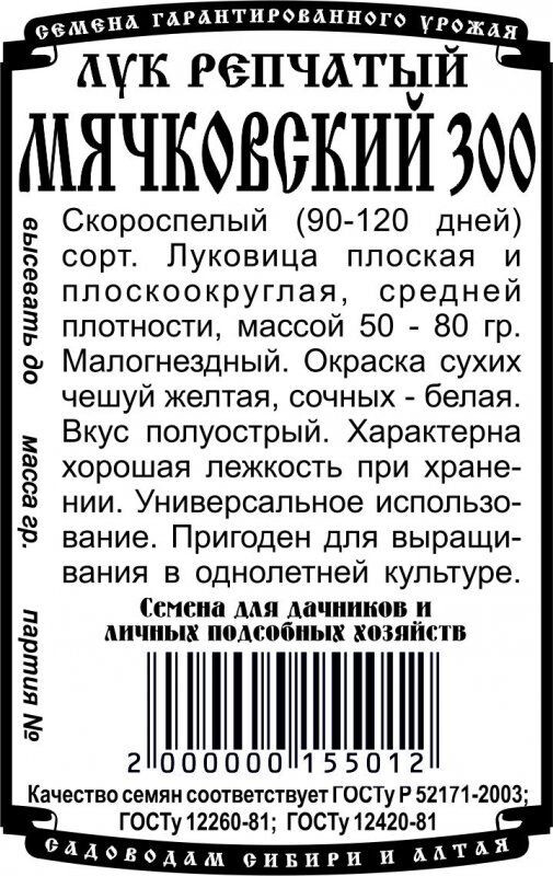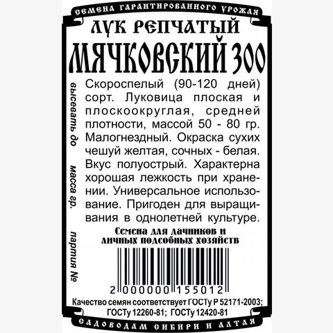 • Скороспелый (90-120 дней) сорт. Луковица плоская и плоскоокруглая, средней плотности, массой 50 - 80 гр. Малогнездный. Окраска сухих чешуй желтая, сочных - белая. Вкус полуострый. Характерна хорошая лежкость при хранении. Универсальное использование. Пригоден для выращивания в однолетней культуре.