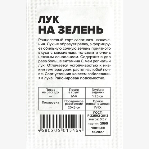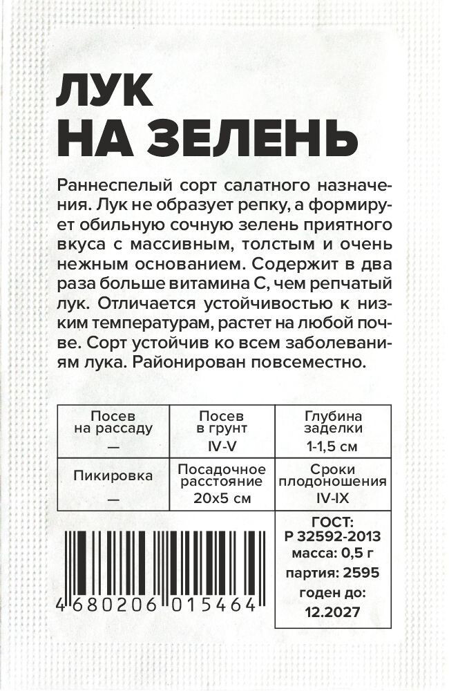 Раннеспелый сорт салатного назначения. Лук не образует репку, а формирует обильную сочную зелень приятного вкуса с массивным, толстым и очень нежным основанием. Содержит в два раза больше витамина С, чем репчатый лук. Отличается устойчивостью к низким температурам, растет на любой почве. Сорт устойчив ко всем заболеваниям лука. Районирован повсеместно. Место посадки: солнечные участки с плодородной нейтральной рыхлой почвой. Размещается после бобовых, капусты, раннего картофеля. При размещении учитывать, что батуны и другие луки на зелень - многолетние Освещение: обильное, плохо переносит затенение Предпосевная подготовка: инкрустированные семена (покрытые цветной оболочкой) не требуют подготовки. Необработанные семена (черные) на 15 минут замочить в термосе с водой температурой 45-50°C Сроки посева: весной сеют в грядку, когда земля прогреется до 10…12°С (март-май) Посев на рассаду: не предусмотрен Посев в грунт: в почву вносят перепревшие органические удобрения и песок, хорошо рыхлят. Бороздки размечают на глубину 1,5 см, между рядками оставляют 15-20 см. Семена раскладывают на уплотненный грунт на расстоянии 2-3 см или пучками через каждые 10-15 см. Присыпают слоем грунта 1,5 см и уплотняют. Обильно поливают горячей водой (65-70°C), накрывают пленкой или укрывным материалом до появления всходов Пикировка/перевалка: не предусмотрено Уход: регулярный и обильный полив на протяжении всего периода вегетации, рыхление междурядий. Для омоложения, во второй половине лета зелень срезают под корень на отрастание