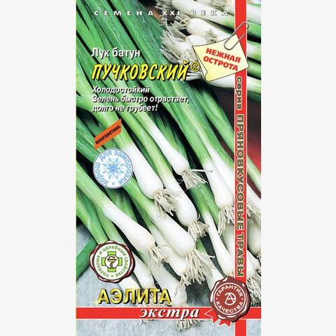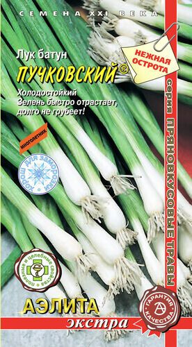 Лук Батун Пучковский. Allium fistulosum L. Новый многолетний среднеранний (от полных всходов до уборки 48-56 дней) сорт салатного назначения. Период от начала отрастания до технической годности при многолетней культуре составляет 39-46 дней. Холодостоек, хорошо зимует. Высокая устойчивость к болезням! Зелень сочная, полуострого вкуса, долго не грубеет, прекрасного качества. Рекомендуется для свежего потребления, заготовок и для заморозки. Масса одного растения 60-70 г. Урожайность за вегетационный период при однолетней культуре – до 6 кг/м2, при многолетней – до 13 кг/м2. Агротехника: Почвы плодородные. Лучшие предшественники - огурец, томаты и бобовые. Посев: Для многолетней культуры – с начала мая до начала июля, в открытый грунт. Глубина заделки семян – 1,0-1,5 см. Схема посадки 20-30х6-7 см. Уход: Прореживание, своевременные поливы, прополки, рыхление и подкормки. Растение выращивают на одном месте 3-4 года. Сбор урожая: Май–август, по мере созревания, до 3-х раз за сезон.