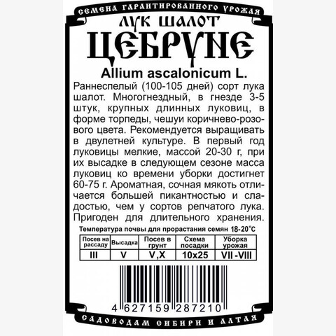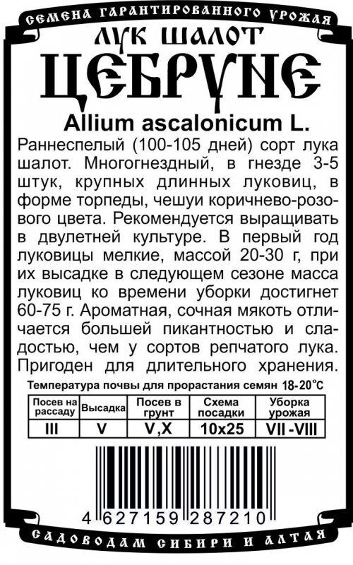 Раннеспелый (100-105 дней) сорт лука шалот. Многогнездный, в гнезде 3-5 штук, крупных длинных луковиц, в форме торпеды, чешуи коричнево-розового цвета. Рекомендуется выращивать в двулетней культуре. В первый год луковицы мелкие, массой 20-30 г, при их высадке в следующем сезоне масса луковиц ко времени уборки достигнет 60-75 г. Ароматная, сочная мякоть отличается большей пикантностью и сладостью, чем у сортов репчатого лука. Пригоден для длительного хранения.