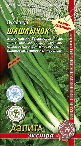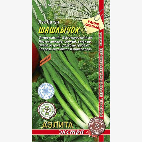 Лук Батун Шашлычок. Allium fistulosum L. Раннеспелый многолетний сорт (24-29 дней от начала отрастания листьев до технической спелости) высотой до 50 см. Листья дудчатые, зеленые, с восковым налетом, диаметром до 1 см, нежные, полуострого вкуса. Отличается высокой урожайностью, высокой зимостойкостью, превосходным вкусом, длительным периодом вегетации. Листья содержат массу полезных минеральных веществ, каротин, витамины С, А. Употребляют их чаще всего в свежем виде, добавляя в готовые блюда. Ароматизируют салаты, супы, омлеты, мясные, рыбные, картофельные блюда, подливки и соусы. Измельченные листья добавляют в начинки для пирогов. Лук батун можно сушить, солить, консервировать. Употребление лука способствует профилактике простудных заболеваний. Аг ро тех ни ка: Почвы плодородные. Лучшие предшественники - огурец, томаты и бобовые. Посев: конец апреля - начало мая, можно высевать летом (июль-август) рядовым способом с расстоянием между рядами 20-30 см, между растениями 4-6 см. Глубина заделки семян – 1-2 см. После прореживания оставляют 6-10 растений на 1 м2. Уход: прополки, рыхление, подкормки и поливы. На одном месте хорошо растет в течение 4-5 лет. Молодые листья срезают на высоте 5-7 см от земли 3-4 раза за период вегетации. После каждой срезки, посадки подкормка и полив. Уборка урожая и хранение: Молодые листья срезают на высоте 5-7 см от земли до 5 раз за период вегетации. Урожайность 3-5 кг/м2.