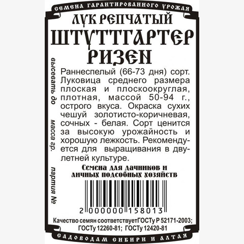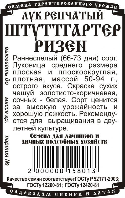 Раннеспелый (66-73 дня), высокоурожайный сорт. Луковицы среднего и крупного размера плоские и плоскоокруглые, плотные, массой 90-180г, острого вкуса. Окраска сухих чешуй золотисто-коричневая, сочных - белая. Ценится за высокую урожайность и хорошую лежкость. Рекомендуется для выращивания в двулетней культуре, но может выращиваться как однолетний через рассаду.