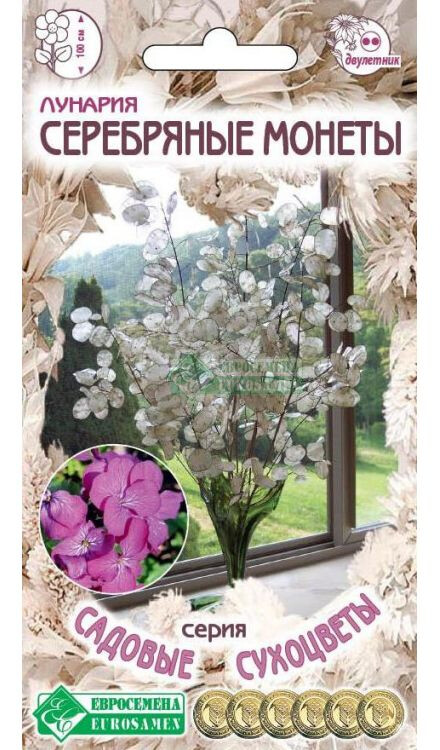 Лунария -уникальное растение семейства Крестоцветные, Родиной которого считаются широколиственные и смешанные леса Европы. В дикой природе она чаще всего произрастает в укромных оврагах и вблизи ручьев. В качестве декоративного растения выращивают с 16 века. Ботаническое название рода происходит от латинского Luna, такое название лунарии получили за форму и цвет семенных коробочек, напоминающих ночное светило, в народе именуют еще как серебряник или лунная трава. Серебряные Монеты- довольно разветвленный куст с ароматными, душистыми, довольно крупными, цветками нежно-сиреневого окраса. Главную эстетичную ценность представляют эффектные плоды, которые по своей форме и окрасу похожи как на полную луну, так и на серебряные монетки. Лунария радует глаз не только в период своего роста, но и после завершения своего жизненного цикла. Это сухоцвет, поэтому часто используют для создания красивых зимних букетов, для этого срезать их надо в конце лета, чтобы уберечь от влияния осенней непогоды.