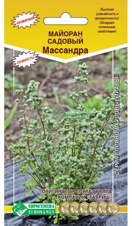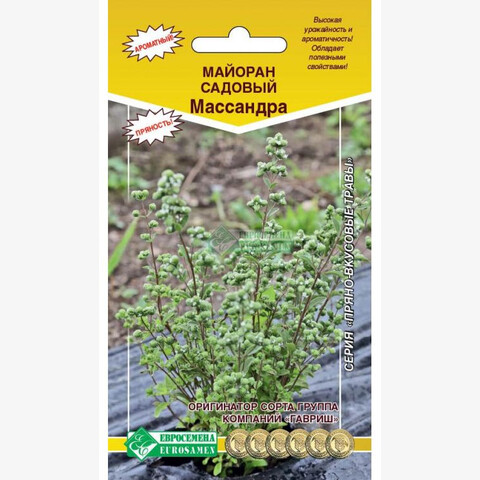 Майоран – он же колбасная трава, душица садовая, травка к жаркому, южанка, кухонная трава- это специя, известная с древних времен. В Древнем Египте, Риме и Греции растение ценили как пряное, целебное и декоративное (для плетения венков). Майорану приписывались многочисленные лекарственные свойства. Считалось, что майоран обладает магическими свойствами. Растение представляет собой однолетнее травянистое растение с высокими ветвистыми стеблями, опушенными ароматными листьями и колосовидными мелкими соцветиями. Листья и эфирное масло из цветков растения применяют в кулинарии, а также в медицинских целях. Майоран обладает многими полезными свойствами и применяется при лечении заболеваний органов пищеварительной, дыхательной, нервной систем. Массандра-среднеспелый сорт майорана садового (115 – 120 дней от полных всходов до уборки). Розетка, высотой 25-29 см, диаметром 27-30 см, полу - приподнятая. Листья мелкие, гладкие, светло-зеленые, овальные по форме. Масса одного растения 20-30 г. Цветки белые. Урожайность в открытом грунте 0,6-0,7 кг/м2. Ценность сорта - высокая ароматичность.