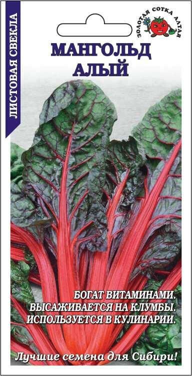 Сорт урожайный. От всходов до первого сбора 38-42 дня, до полной хозяйственной годности 80-90 дней. Розетка раскидистая, высотой 50-70 см. Листья фиолетово-зеленые, слабопузырчатые, черешки длиной до 27 см, малиново-красные. В пищу используют всю наземную часть. Нежные листья употребляют в свежем и вареном виде, добавляют в овощные супы, из них готовят голубцы и заготовки на зиму. Молодые черешки используют в свежем виде как салатное растение, зрелые — тушат, отваривают или готовят на пару, добавляют в супы, маринуют и консервируют. Мангольд содержит витамины C, В1, В2, РР, каротин, соли натрия, калия, железа, а также белки и сахара. Листовая свекла повышает иммунитет, налаживает работу печени, улучшает лимфоток. Рекомендуется для включения в рацион при малокровии, гипертонии, сахарном диабете и ожирении. Благодаря очень декоративному внешнему виду мангольд прекрасно подходит для ландшафтного озеленения.