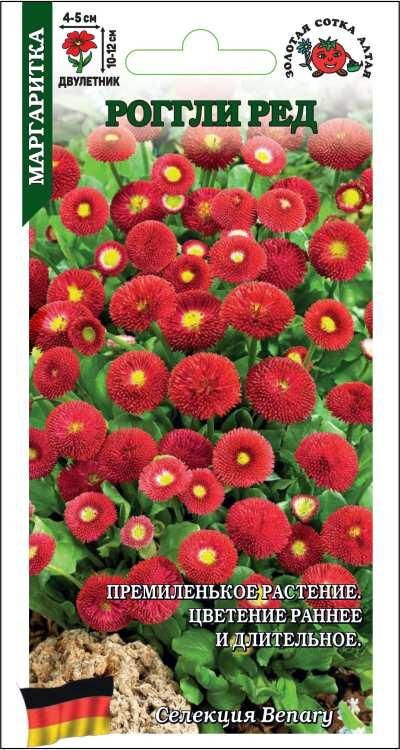 Премиленькое морозостойкое растение. Маргаритки серии Roggli от немецкой компании Benary характеризуются ранним и длительным цветением не только на солнце, но и в полутени. Листочки лопатчатые, собраны в пышную прикорневую розетку, над которой на второй год вырастают крепкие безлистные цветоносы. Соцветия крупные, густомахровые, насыщенной красной окраски. Маргаритки отлично подходят для декорирования края водоемов, украшения переднего плана миксбордеров и создания бордюра, великолепно смотрятся на каменистых горках, в вазонах и балконных ящиках, прекрасно сочетаются с другими весеннецветущими растениями. Из маргариток получаются восхитительные миниатюрные букетики.