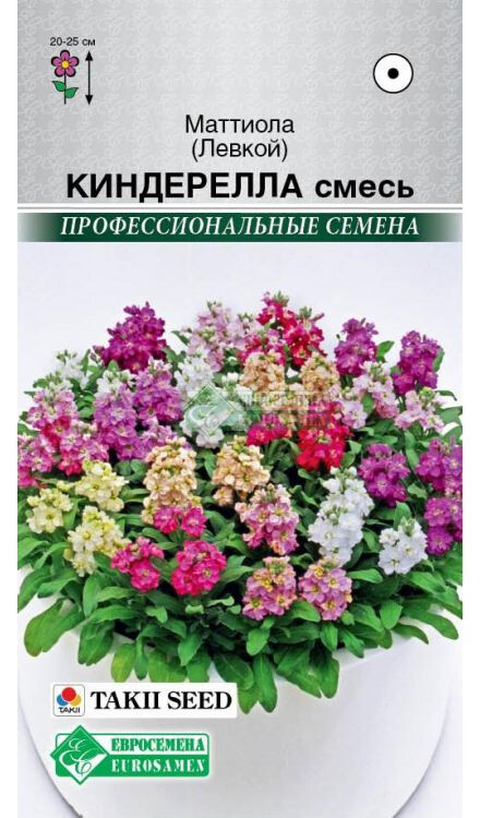 Маттиола ( левкой) – цветущее травянистое растение, относящееся к семейству Крестоцветные, ее Родина – Средиземноморье. Разновидностей левкоев много – более 600, они различаются по высоте, окраске и форме цветка, типу ветвления. Киндерелла- серия супер компактных растений с крупными махровыми цветками, прекрасное дополнение к ассортименту контейнерных растений. Несмотря на маленький рост, она очень декоративна. Смесь представлена яркими различными расцветками: белой, розовой, пурпурной, красной, желтой. Растения отличаются неприхотливостью в выращивании и быстрым ростом, ранним и длительным цветением, ценится за компактный габитус и махровость цветков с нежным ароматом. С наступлением летнего вечера цветы распускаются, даря свой аромат, место в цветнике выделяют чаще всего возле террас, беседок, окон дома, это идеальное решение озеленения балконов и веранд. Яркие цветки будут прекрасно смотреться именно в смеси, радуя своими яркими расцветками.
