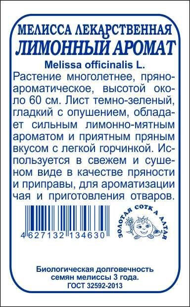 Многолетнее пряно-ароматическое растение высотой около 60 см. Листья темно-зеленые, со слабым восковым налетом, опушенные. Аромат сильный, лимонно-мятный. Вкус приятный, пряный, с легкой горчинкой. Используют в качестве приправы, для отдушки чая, уксусов, приготовления отваров и освежающих напитков, ароматизации ликеров и настоек. Ценится за высокое содержание эфирных масел, органических кислот и каротина.