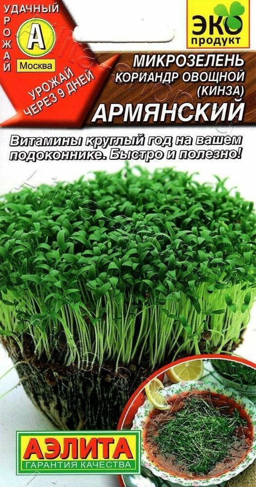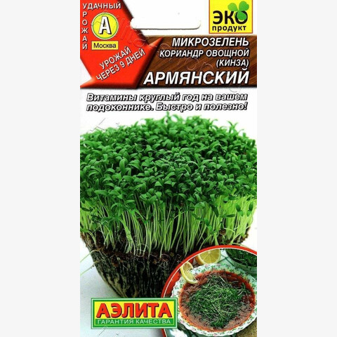Микрозелень кинзы (кориандра) – это неповторимый пряный аромат и удивительный вкус, который намного приятнее чем у взрослых растений. При росте 5-8 см микрозелень можно употреблять не только в срезанном виде, но и целиком, вместе с корешочками, предварительно промыв от субстрата. Молодая кинза особенно хороша для витаминных салатов, супов и рыбных блюд, а некоторые мясные блюда без неё даже трудно представить. Состав: кориандр овощной Армянский.