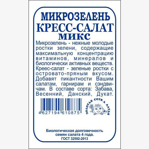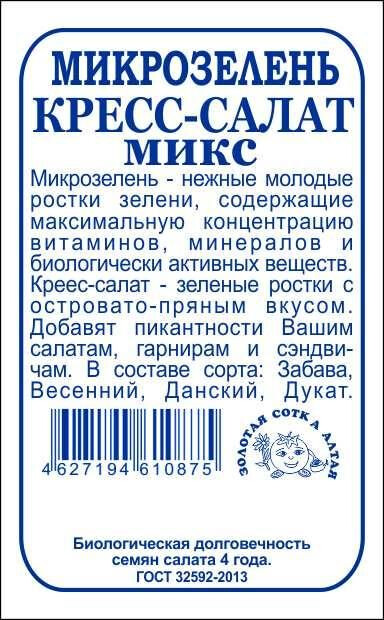 Микрозелень (микрогрин) — это современный суперфуд! Микро-зелень проста в выращивании, содержит намного больше витаминов и важных элементов, чем взрослые растения, подходит для круглогодичного возделывания. Кресс-салат богат каротином, витаминами группы B, железом и магнием. Ростки со специфическим ароматом и острым горчичным привкусом. Хорошее дополнение к гарнирам, бутербродам, салатам и соусам.
