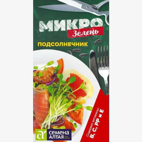 Микрозелень подсолнечника содержит аминокислоты, витамины группы B, С, PP и Е, холин, микроэлементы (калий, магний) и клетчатку. Имеет насыщенный вкус, характерный для молодых семян подсолнечника, и очень яркий аромат. Всходы появляются на 3-5 день. Пригодна для срезки на 9-13 день. Идеально подходит к белой рыбе, красному мясу, брускеттам с вялеными томатами, а также для бобовых блюд, скрэмбла и омлета. Микрозелень – одно из направлений суперфуда. Это богатая витаминами и микроэлементами добавка к основным блюдам. Оптимальным вариантом для выращивания микрозелени в домашних условиях является использование специальных проращивателей или проращивание семян в увлажненном торфяном субстрате: - равномерно распределите субстрат тонким слоем 1,5-2,0 см в посадочной емкости; - семена рекомендуется подготовить, замочив их перед посевом в темно-розовом растворе марганцовки на 20 минут; - распределите семена по поверхности субстрата. Важно производить посев не слишком густо во избежание загнивания посевов; - заглублять семена не нужно, можно присыпать небольшим рыхлым слоем торфа, не более 3 мм; - посевы увлажнить из пульверизатора теплой водой. До появления первых всходов посадочную емкость можно накрыть стеклом или пленкой для поддержания влажности, но важно периодически проветривать посевы. После появления первых всходов укрытие снимают и периодически увлажняют посевы.