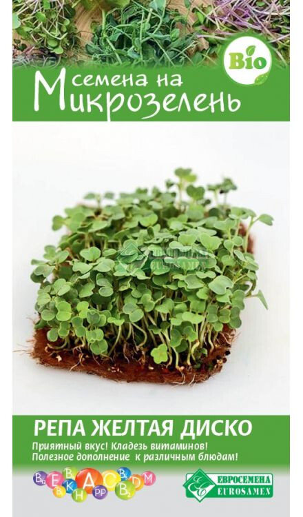 Микрозелень — это не только мода, но и экологически чистый продукт! В нежных молодых проростках содержится больше витаминов и важных для нашего организма элементов, чем в самих овощах. В качестве микрозелени можно выращивать практически все культуры. За первые 10 дней своей жизни молодая зелень не успевает накопить в себе вредных веществ из атмосферы, поэтому несет в себе максимум пользы. Она отличается по вкусу в зависимости от культуры. Микрозелень репы- растения с семядольными и 2-3 настоящими листочками зеленого цвета. Листочки сочные с легким ароматом репы, в которых максимально высокое содержание витаминов и биологически активных веществ. Микрозелень из репы желтой рекомендуется использовать как самостоятельное блюдо и полезное дополнение к салатам, блюдам из мяса, супам, отварным и тушеным овощам.