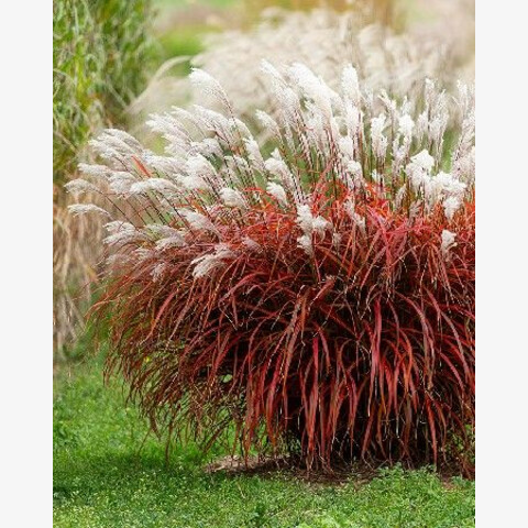 • темно-фиолетовая и зеленая листва весной, которая осенью приобретает поразительный ярко-красный цвет над которой возвышаются пушистые белые метелки, высота с метелками 160см