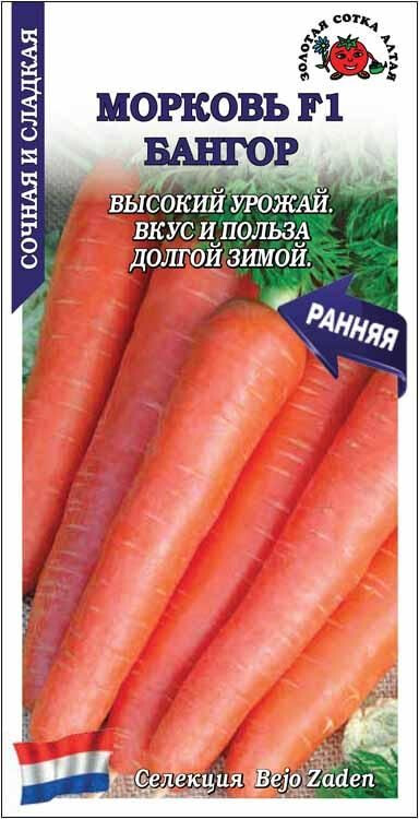 Ранний высокоурожайный гибрид, пригодный к механизированной уборке. Вегетационный период 100-110 дней. Розетка листьев полувертикальная, мощная. Корнеплоды длинные, цилиндрические с тупым кончиком, выравненные, массой 120-200 г (до 400 г), ярко-оранжевые, сочные и сладкие. Гибрид используется в свежем виде и для переработки, приготовления соков и салатов, прекрасно хранится, сохраняя вкус и пользу.