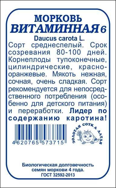 Сорт среднеспелый, урожайный. От всходов до хозяйственной годности 80-100 дней. Корнеплоды цилиндрической формы, тупоконечные, красно-оранжевые. Мякоть нежная и сочная, очень сладкая. Сорт рекомендуется для непосредственного потребления (особенно хорош для детского питания) и переработки. Лидер по содержанию каротина!