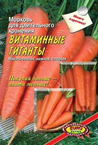 МОРКОВЬ смесь сортов для длительного хранения ВИТАМИННЫЕ ГИГАНТЫ Сорта средне-поздние (95-130 дней от появления всходов). Мякоть красно-оранжевая нежная, сочная, сладкая, отличных вкусовых качеств, с большим содержанием каротина. Рекомендуются для потребления в свежем виде, переработки и длительного хранения. Сорт Берликум (110-130 дней) корнеплоды цилиндрические, гладкие, длиной 20-23 см, массой 200-260 г. Сорт Флакке (110-130 дней) корнеплоды конусовидные, длиной 19-22 см, массой 100-180 г. Сорт Шантене роял (95-106 дней) корнеплоды конусовидные, тупоконечные, длиной 16-18 см, массой 100-250 г. Урожайность 4-10 кг/м2. Агротехника: Почва лёгкая суглинистая. Лучшие предшественники: картофель, лук, томаты, огурцы, бобовые. Весной перед посевом вносят комплексное минеральное удобрение (рекомендуем «АЭЛИТА-ОВОЩНОЕ»). Посев: в конце апреля в бороздки на глубину 3-4 см. Расстояние между рядами 20 см. Прореживают через 2 недели после всходов и, когда корнеплоды достигнут Ø1 см, оставляют между ними 5-6 см. Уход: Прополка, рыхление, полив. Посев под зиму проводят, когда t° опустит- ся до 5°С (2-я половина октября – ноябрь). Семена заделывают на глубину 1-2 см, поверхность мульчируют торфом.