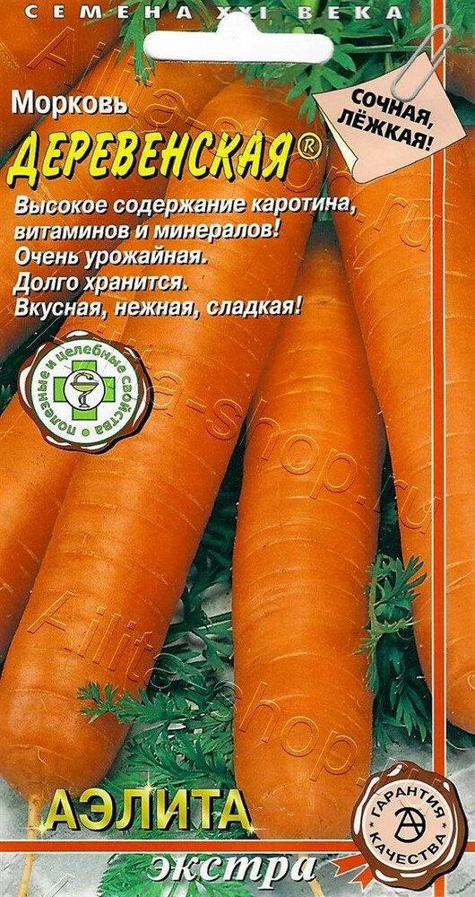 Сорт среднеспелый, высокоурожайный. Корнеплоды цилиндрические, тупоконечные. Сердцевина очень маленькая, красно-оранжевая, мякоть красно-оранжевая, сочная, нежная, сладкая, кора оранжевая. Масса корнеплода 130-210 г, длина 19-21 см, диаметр 2,5-3 см, ботва средней длины. Сорт отличается превосходной лёжкостью, высокими вкусовыми качествами и высокотоварным видом корнеплодов, высоким содержанием каротина, сахара и полезных веществ. Рекомендуется для использования в свежем виде, для изготовления высококачественных сладких соков и пюре, для хранения.