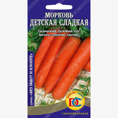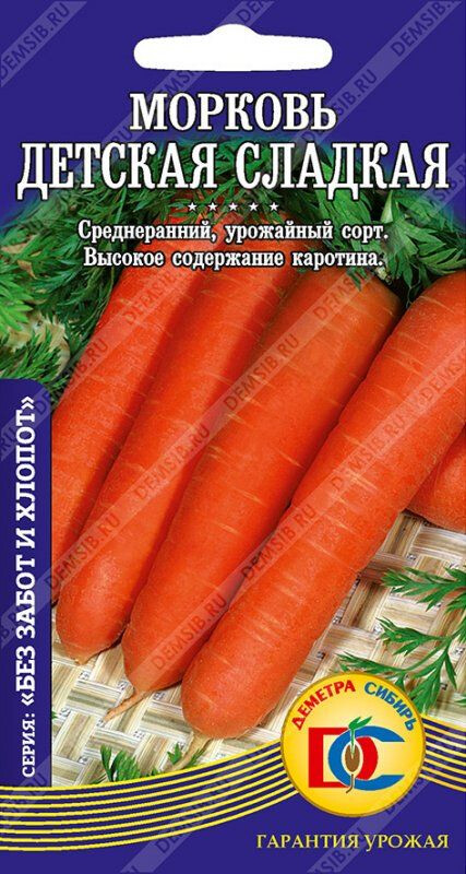 Среднеспелый (110-120 дней) высокоурожайный сорт. Корнеплоды цилиндрические, тупоконечные, гладкие, длиной 19-22 см, массой до 200г. Сердцевина маленькая. Мякоть красно-оранжевая, сочная, нежная, очень сладкая, с повышенным содержанием каротина. Рекомендуется для потребления в свежем виде, приготовления соков и пюре для детского питания