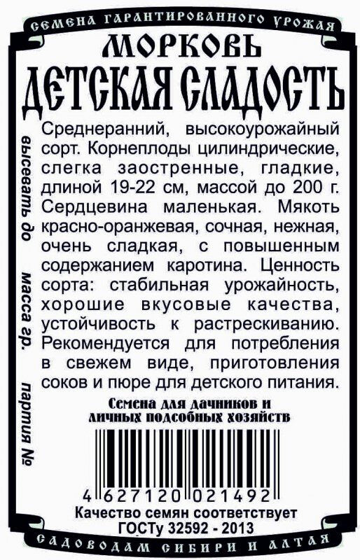 • Среднеспелый (110-120 дней) высокоурожайный сорт. Корнеплоды цилиндрические, тупоконечные, гладкие, длиной 19-22 см, массой до 200г. Сердцевина маленькая. Мякоть красно-оранжевая, сочная, нежная, очень сладкая, с повышенным содержанием каротина. Рекомендуется для потребления в свежем виде, приготовления соков и пюре для детского питания.
