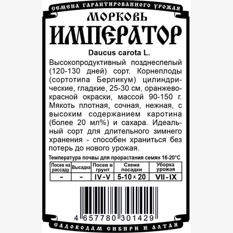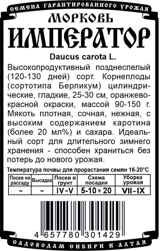 Высокопродуктивный позднеспелый (120-130 дней) сорт. Корнеплоды (сортотипа Берликум) цилиндрические, гладкие, 25-30 см, оранжево-красной окраски, массой 90-150 г. Мякоть плотная, сочная, нежная, с высоким содержанием каротина (более 20 мл%) и сахара. Идеальный сорт для длительного зимнего хранения - способен храниться без потерь до нового урожая.