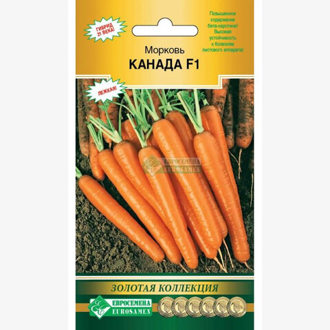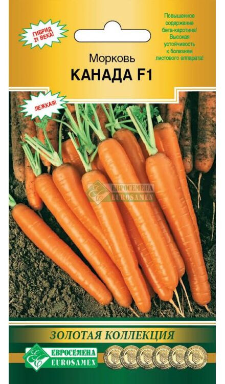 Морковь – старейшее овощное растение, которое употребляется людьми уже более 4 тысяч лет, она одна из самых популярных овощей у россиян. Такая всенародная любовь к моркови не случайна, ведь она - настоящий кладезь витаминов и полезных микроэлементов. Канада F1 - надежный, очень урожайный гибрид для использования в свежем виде, хранения и переработки. Среднепоздний, период от полных всходов до технической спелости 120-130 дней. Корнеплоды длинные, конической формы (Шантане/Флакке) со слегка заостренным кончиком, массой 130-170 г. Окраска корнеплодов и сердцевины оранжевого цвета, вкус отличный. Содержание сухого вещества-14,3%, каротина- 21 мг на 100 г сырого вещества. Дает великолепные результаты в самых тяжелых почвенно-климатических условиях. Имеет высокую устойчивость к болезням.