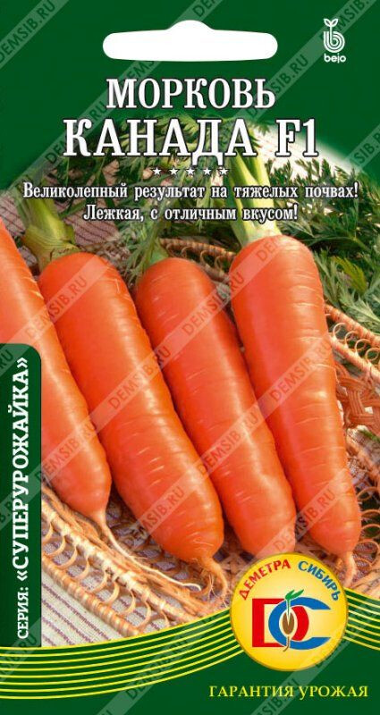 "Канаде F1" - не каждый гибрид даст фору. Его высокая, стабильная урожайность, пластичность, прекрасные товарные качества, отличный вкус, универсальное использование, в том числе и длительное хранение, обеспечили заслуженную популярность у садоводов и фермеров. Сроки созревания среднепоздние 120-130 дней. Корнеплоды выровненные, конические (тип Шантанэ/Данверс), интенсивной оранжевой окраски, гладкие. Массой 170-250 г. Великолепный результат даже в самых тяжелых почвенно-климатических условиях.