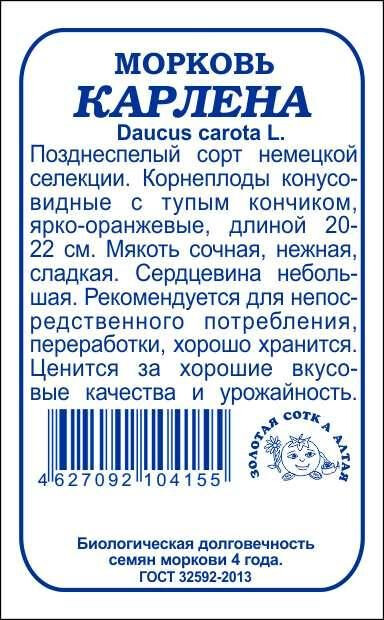 Позднеспелый сорт немецкой селекции. Корнеплоды конусовидные с тупым кончиком, ярко-оранжевые, длиной 20-22 см. Мякоть сочная, нежная, сладкая. Сердцевина небольшая. Рекомендуется для непосредственного потребления, переработки, хорошо хранится. Ценится за хорошие вкусовые качества и урожайность.