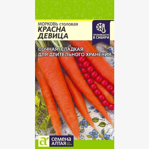 Позднеспелый (115-135 дней) высокоурожайный сорт. Корнеплод удлиненный, конической формы, со слегка вытянутым кончиком, массой до 200 г. Мякоть нежная, сочная. Корнеплоды выравненные, насыщенного красно-оранжевого цвета. Сорт отличается великолепными вкусовыми качествами, отлично хранится, способен переносить небольшие заморозки. Место посадки: выровненные участки с рыхлой плодородной супесчаной или легкосуглинистой почвой Освещение: обильное, плохо переносит затенение Предпосевная подготовка: не требуется. Для более дружных всходов допускается на 15 минут замочить в воде температурой 50°С Сроки посева: сразу после оттаивания почвы (апрель-май), либо середина июня, либо осенью после промерзания грунта (сухим способом) Посев на рассаду: не предусмотрен Посев в грунт: за 1-2 дня до посева проводят обильный полив, рыхление и выравнивание почвы. Семена высевают в предварительно увлажненные борозды на глубину 1-2 см (чем больше в почве песка, тем глубже), оставляя междурядья 10 см и 3-4 см между растениями. Присыпают грунтом, хорошо уплотняют. После посева проводят еще один полив дождеванием. Для сохранения влажности почвы посевы накрывают агроволокном до появления всходов. Полив проводят поверх укрывного материала Пикировка/перевалка: не предполагается Уход: всходы прореживают на расстояние 3-4 см. Не выносит свежего навоза, при его внесении образует искривленные корнеплоды с множеством корней. На бедных почвах проводят подкормку азофоской в количестве 15г/10 л воды один раз в месяц Сбор урожая: август - октябрь