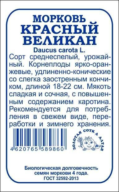 Высокоурожайный среднеспелый сорт. Корнеплоды удлиненно-конические со слабым сбегом и слегка заостренным кончиком, длиной 18-22 см, ярко-оранжевые. Мякоть сладкая и сочная, с повышенным содержанием каротина. Сорт рекомендуется для потребления в свежем виде, переработки и длительного зимнего хранения.