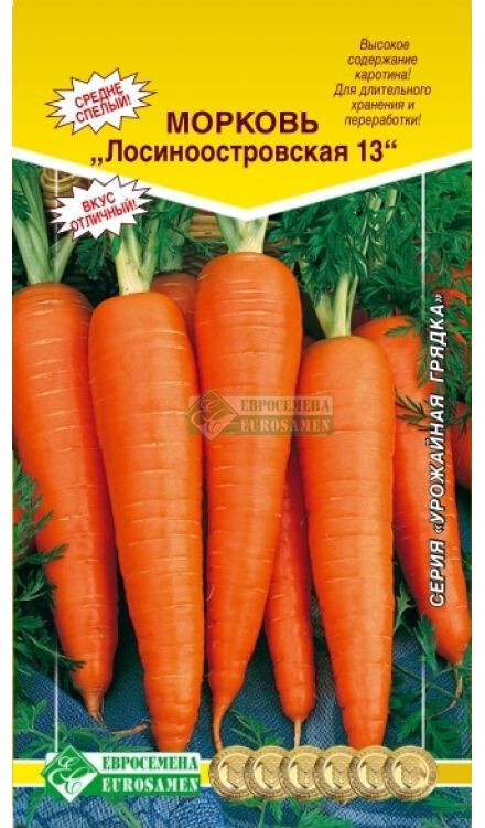 Сорт среднеспелый, период от всходов до технической спелости 90-100 дней. Корнеплод цилиндрический, слабо сужающийся к основанию, длиной 16-18 см, массой корнеплода 160-170 г, с повышенным содержанием каротина. Мякоть оранжевая, сочная. Устойчив к цветушности. Посев в самые ранние сроки, в конце апреля-начале мая, возможен подзимний посев, на глубину 2-2,5 см, с шагом между строчками 20 см.Посевы до всходов желательно укрыть плёнкой. Морковь богата витаминами В1, В2, С, ЗЗ, К. Морковный сок – отличное целебное средство при малокровии,заболеваниях сердечно-сосудистой системы, почек .