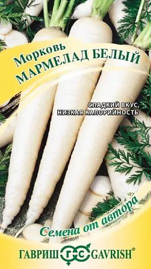 Морковь белого оттенка является уникальным селекционным овощем, который всё больше завоевывает поклонников в нашей стране. Отличается высокой урожайностью, отменными вкусовыми качествами и низкой калорийностью. Имеет широкое применение в диетическом питании. Среднеспелый (105-110 дней) урожайный сорт. Корнеплод удлиненно-конический, кремово-белого цвета, длиной 17-22 см., с выступающей над землей зеленоватой головкой. Масса корнеплодов 180-250 гр. (до 400 гр. и более в зависимости от условий выращивания). Мякоть маслянистая, белая, сладкая, хрустящая и ароматная. Яркие, крупные корнеплоды хорошо и долго хранятся до мая. Рекомендуются для приготовления свежих салатов, витаминных соков, разноцветной нарезки, запеканок. Посев семян в грунт производится в конце апреля–начале мая на глубину 1 см., расстояние между рядками 15 см. Подросшие всходы прореживают, оставляя между растениями по 5–7 см.