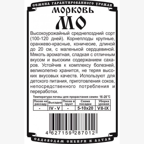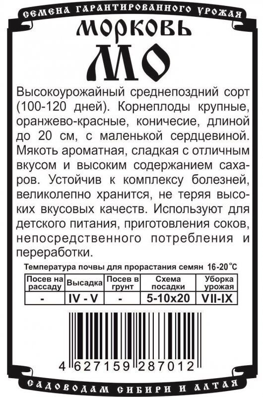 Высокоурожайный среднепоздний сорт (100-120 дней). Корнеплоды крупные, оранжево-красные, коничесие, длиной до 20 см, с маленькой сердцевиной. Мякоть ароматная, сладкая с отличным вкусом и высоким содержанием сахаров. Устойчив к комплексу болезней, великолепно хранится, не теряя высоких вкусовых качеств. Используют для детского питания, приготовления соков, непосредственного потребления и переработки.