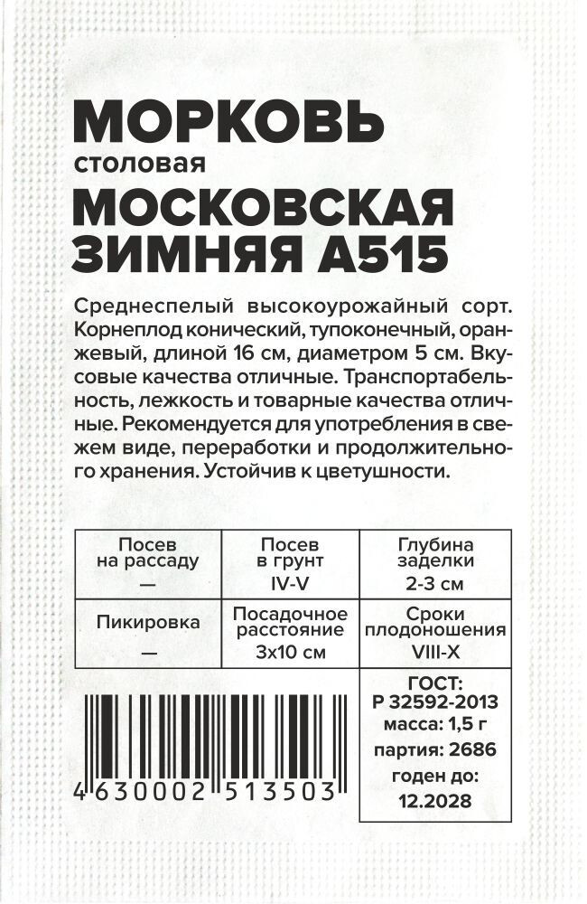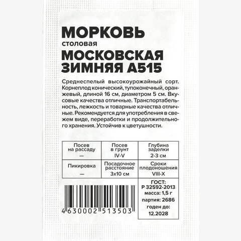 Среднеспелый высокоурожайный сорт. Корнеплод конический, тупоконечный, оранжевый, длиной 16 см, диаметром 5 см. Вкусовые качества отличные. Транспортабельность, лёжкость и товарные качества отличные. Рекомендуется для употребления в свежем виде, переработки и продолжительного хранения. Устойчив к цветушности. Место посадки: выровненные участки с рыхлой плодородной супесчаной или легкосуглинистой почвой Освещение: обильное, плохо переносит затенение Предпосевная подготовка: не требуется. Для более дружных всходов допускается на 15 минут замочить в воде температурой 50°С Сроки посева: сразу после оттаивания почвы (апрель-май), либо середина июня, либо осенью после промерзания грунта (сухим способом) Посев на рассаду: не предусмотрен Посев в грунт: за 1-2 дня до посева проводят обильный полив, рыхление и выравнивание почвы. Семена высевают в предварительно увлажненные борозды на глубину 1-2 см (чем больше в почве песка, тем глубже), оставляя междурядья 10 см и 3-4 см между растениями. Присыпают грунтом, хорошо уплотняют. После посева проводят еще один полив дождеванием. Для сохранения влажности почвы посевы накрывают агроволокном до появления всходов. Полив проводят поверх укрывного материала Пикировка/перевалка: не предполагается Уход: всходы прореживают на расстояние 3-4 см. Не выносит свежего навоза, при его внесении образует искривленные корнеплоды с множеством корней. На бедных почвах проводят подкормку азофоской в количестве 15г/10 л воды один раз в месяц Сбор урожая: август - октябрь