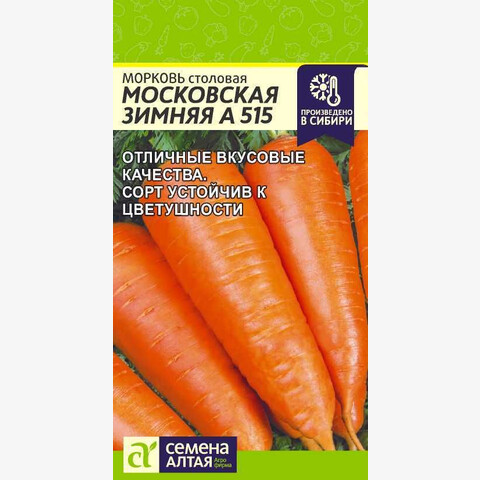 Среднеспелый высокоурожайный сорт. Корнеплод конический, тупоконечный, оранжевый, длиной 16 см, диаметром 5 см. Вкусовые качества отличные. Транспортабельность, лёжкость и товарные качества отличные. Рекомендуется для употребления в свежем виде, переработки и продолжительного хранения. Устойчив к цветушности. Место посадки: выровненные участки с рыхлой плодородной супесчаной или легкосуглинистой почвой Освещение: обильное, плохо переносит затенение Предпосевная подготовка: не требуется. Для более дружных всходов допускается на 15 минут замочить в воде температурой 50°С Сроки посева: сразу после оттаивания почвы (апрель-май), либо середина июня, либо осенью после промерзания грунта (сухим способом) Посев на рассаду: не предусмотрен Посев в грунт: за 1-2 дня до посева проводят обильный полив, рыхление и выравнивание почвы. Семена высевают в предварительно увлажненные борозды на глубину 1-2 см (чем больше в почве песка, тем глубже), оставляя междурядья 10 см и 3-4 см между растениями. Присыпают грунтом, хорошо уплотняют. После посева проводят еще один полив дождеванием. Для сохранения влажности почвы посевы накрывают агроволокном до появления всходов. Полив проводят поверх укрывного материала Пикировка/перевалка: не предполагается Уход: всходы прореживают на расстояние 3-4 см. Не выносит свежего навоза, при его внесении образует искривленные корнеплоды с множеством корней. На бедных почвах проводят подкормку азофоской в количестве 15г/10 л воды один раз в месяц Сбор урожая: август - октябрь