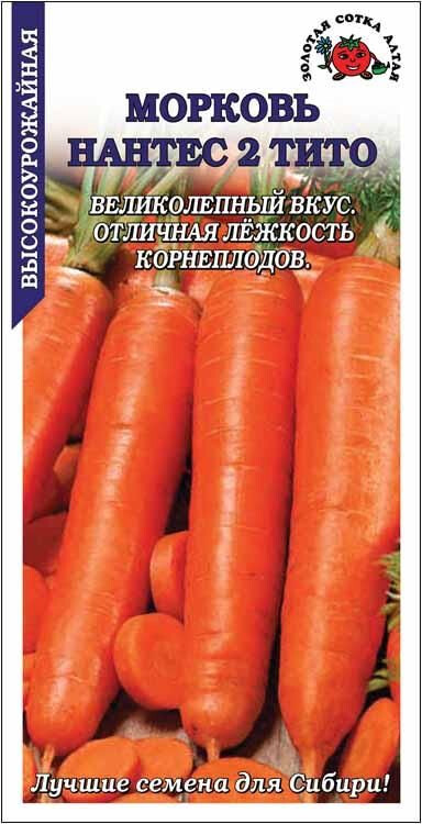Среднеранний сорт со стабильно высокой урожайностью. От всходов до созревания 90-110 дней. Корнеплоды цилиндрической формы, со слегка заостренным кончиком, средней массой 185 г, ярко-оранжевые, с маленькой слабовыраженной сердцевиной. Мякоть нежная, отличных вкусовых качеств. Сорт рекомендуется для потребления в свежем виде, заморозки и переработки, отлично хранится.
