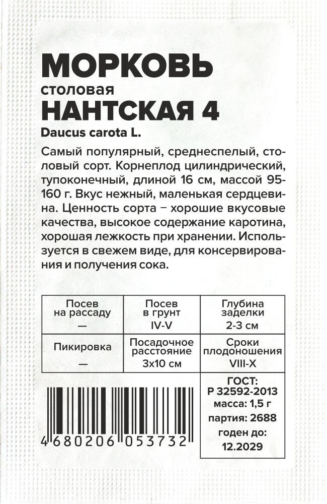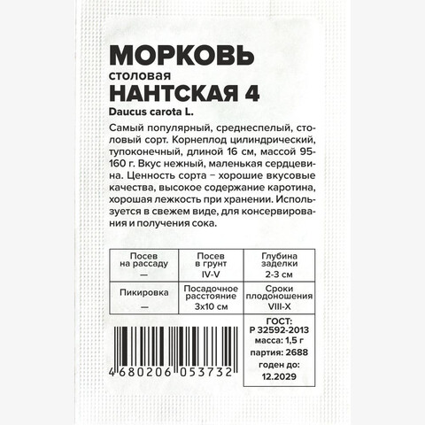 Самый популярный, среднеспелый, столовый сорт. Корнеплод цилиндрический, тупоконечный, длиной 16 см, массой 95-160 г. Вкус нежный, маленькая сердцевина. Ценность сорта ? хорошие вкусовые качества, высокое содержание каротина, хорошая лежкость при хранении. Используется в свежем виде, для консервирования и получения сока. Место посадки: выровненные участки с рыхлой плодородной супесчаной или легкосуглинистой почвой Освещение: обильное, плохо переносит затенение Предпосевная подготовка: не требуется. Для более дружных всходов допускается на 15 минут замочить в воде температурой 50°С Сроки посева: сразу после оттаивания почвы (апрель-май), либо середина июня, либо осенью после промерзания грунта (сухим способом) Посев на рассаду: не предусмотрен Посев в грунт: за 1-2 дня до посева проводят обильный полив, рыхление и выравнивание почвы. Семена высевают в предварительно увлажненные борозды на глубину 1-2 см (чем больше в почве песка, тем глубже), оставляя междурядья 10 см и 3-4 см между растениями. Присыпают грунтом, хорошо уплотняют. После посева проводят еще один полив дождеванием. Для сохранения влажности почвы посевы накрывают агроволокном до появления всходов. Полив проводят поверх укрывного материала Пикировка/перевалка: не предполагается Уход: всходы прореживают на расстояние 3-4 см. Не выносит свежего навоза, при его внесении образует искривленные корнеплоды с множеством корней. На бедных почвах проводят подкормку азофоской в количестве 15г/10 л воды один раз в месяц Сбор урожая: август - октябрь