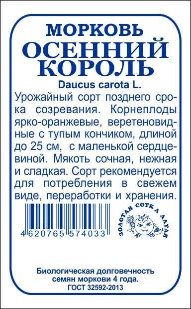 Урожайный сорт позднего срока созревания. Корнеплоды веретеновидные с тупым кончиком, длиной до 25 см, ярко-оранжевые, с маленькой сердцевиной. Мякоть сочная, нежная, сладкая. Сорт рекомендуется для потребления в свежем виде, переработки и длительного зимнего хранения.