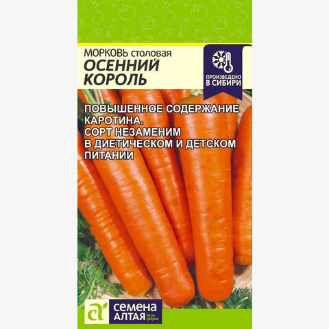 Среднеспелый высокоурожайный сорт. Период от всходов до технической спелости 110-120 дней. Форма корнеплода цилиндрическая, длина доходит до 25 см. Масса корнеплода 100-250 г, окраска оранжевая, мякоть сочная, сладкая. Сорт очень транспортабелен, обладает высокой лежкостью, устойчив к различным заболеваниям. Место посадки: выровненные участки с рыхлой плодородной супесчаной или легкосуглинистой почвой Освещение: обильное, плохо переносит затенение Предпосевная подготовка: не требуется. Для более дружных всходов допускается на 15 минут замочить в воде температурой 50°С Сроки посева: сразу после оттаивания почвы (апрель-май), либо середина июня, либо осенью после промерзания грунта (сухим способом) Посев на рассаду: не предусмотрен Посев в грунт: за 1-2 дня до посева проводят обильный полив, рыхление и выравнивание почвы. Семена высевают в предварительно увлажненные борозды на глубину 1-2 см (чем больше в почве песка, тем глубже), оставляя междурядья 10 см и 3-4 см между растениями. Присыпают грунтом, хорошо уплотняют. После посева проводят еще один полив дождеванием. Для сохранения влажности почвы посевы накрывают агроволокном до появления всходов. Полив проводят поверх укрывного материала Пикировка/перевалка: не предполагается Уход: всходы прореживают на расстояние 3-4 см. Не выносит свежего навоза, при его внесении образует искривленные корнеплоды с множеством корней. На бедных почвах проводят подкормку азофоской в количестве 15г/10 л воды один раз в месяц Сбор урожая: август - октябрь