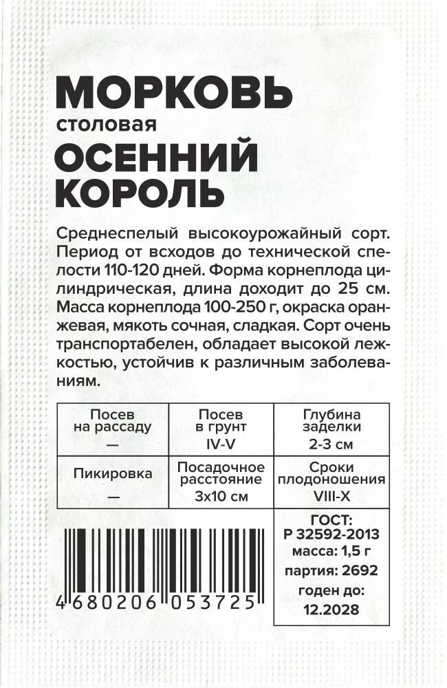 Среднеспелый высокоурожайный сорт. Период от всходов до технической спелости 110-120 дней. Форма корнеплода цилиндрическая, длина доходит до 25 см. Масса корнеплода 100-250 г, окраска оранжевая, мякоть сочная, сладкая. Сорт очень транспортабелен, обладает высокой лежкостью, устойчив к различным заболеваниям. Место посадки: выровненные участки с рыхлой плодородной супесчаной или легкосуглинистой почвой Освещение: обильное, плохо переносит затенение Предпосевная подготовка: не требуется. Для более дружных всходов допускается на 15 минут замочить в воде температурой 50°С Сроки посева: сразу после оттаивания почвы (апрель-май), либо середина июня, либо осенью после промерзания грунта (сухим способом) Посев на рассаду: не предусмотрен Посев в грунт: за 1-2 дня до посева проводят обильный полив, рыхление и выравнивание почвы. Семена высевают в предварительно увлажненные борозды на глубину 1-2 см (чем больше в почве песка, тем глубже), оставляя междурядья 10 см и 3-4 см между растениями. Присыпают грунтом, хорошо уплотняют. После посева проводят еще один полив дождеванием. Для сохранения влажности почвы посевы накрывают агроволокном до появления всходов. Полив проводят поверх укрывного материала Пикировка/перевалка: не предполагается Уход: всходы прореживают на расстояние 3-4 см. Не выносит свежего навоза, при его внесении образует искривленные корнеплоды с множеством корней. На бедных почвах проводят подкормку азофоской в количестве 15г/10 л воды один раз в месяц Сбор урожая: август - октябрь