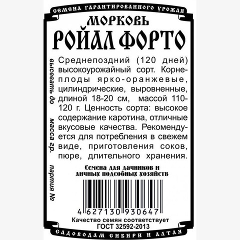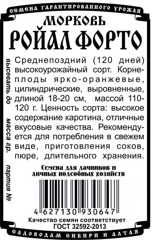 Среднепоздний (120 дней) высокоурожайный сорт. Корнеплоды ярко-оранжевые, цилиндрические, выровненные, длиной 18-20 см, массой 110-120 г. Ценность сорта: высокое содержание каротина, отличные вкусовые качества. Рекомендуется для потребления в свежем виде, приготовления соков, пюре, длительного хранения.