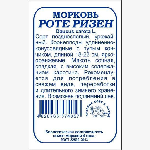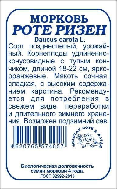 Сорт позднеспелый, урожайный. Корнеплоды ярко-оранжевые, удлиненно-конусовидной формы с тупым кончиком, длиной 18-22 см. Мякоть сочная, сладкая, с высоким содержанием каротина. Сорт рекомендуется для потребления в свежем виде, переработки и дли-тельного зимнего хранения.