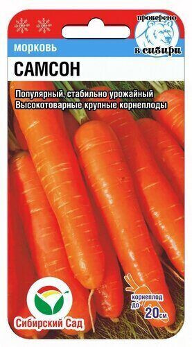 Отличный среднепоздний гибрид голландской селекции. Период от всходов до уборки урожая 112-115 дней. Корнеплод цилиндрический с тупым кончиком длинной 20-22 см, массой 150-220 грамм. Окраска корнеплода красно-оранжевая. Вкусовые качества отличные. Ценность сорта – стабильная урожайность, устойчивость к болезням и хорошая сохранность. Семена высевают в грунт на глубину 1-1.5 см рано весной и под зиму, междурядьями 25 см и расстоянием между растениями в рядке 3-4 см. Через 2 недели после всходов прореживают. Второе прореживанием проводят, когда корнеплоды достигнут в диаметре 1 см. Дальнейший уход заключается в прополке, рыхлении и поливе. Для ускорения процесса всхожести семян, оздоровления растений, улучшения завязываемости плодов рекомендуется пользоваться специально разработанными стимуляторами роста и развития растений.