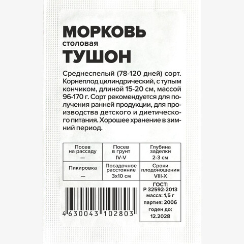 Среднеспелый (78-120 дней) сорт. Корнеплод цилиндрический, с тупым кончиком, длиной 15-20 см, массой 96-170 г. Сорт рекомендуется для получения ранней продукции, для производства детского и диетического питания. Хорошее хранение в зимний период. Место посадки: выровненные участки с рыхлой плодородной супесчаной или легкосуглинистой почвой Освещение: обильное, плохо переносит затенение Предпосевная подготовка: не требуется. Для более дружных всходов допускается на 15 минут замочить в воде температурой 50°С Сроки посева: сразу после оттаивания почвы (апрель-май), либо середина июня, либо осенью после промерзания грунта (сухим способом) Посев на рассаду: не предусмотрен Посев в грунт: за 1-2 дня до посева проводят обильный полив, рыхление и выравнивание почвы. Семена высевают в предварительно увлажненные борозды на глубину 1-2 см (чем больше в почве песка, тем глубже), оставляя междурядья 10 см и 3-4 см между растениями. Присыпают грунтом, хорошо уплотняют. После посева проводят еще один полив дождеванием. Для сохранения влажности почвы посевы накрывают агроволокном до появления всходов. Полив проводят поверх укрывного материала Пикировка/перевалка: не предполагается Уход: всходы прореживают на расстояние 3-4 см. Не выносит свежего навоза, при его внесении образует искривленные корнеплоды с множеством корней. На бедных почвах проводят подкормку азофоской в количестве 15г/10 л воды один раз в месяц Сбор урожая: август - октябрь